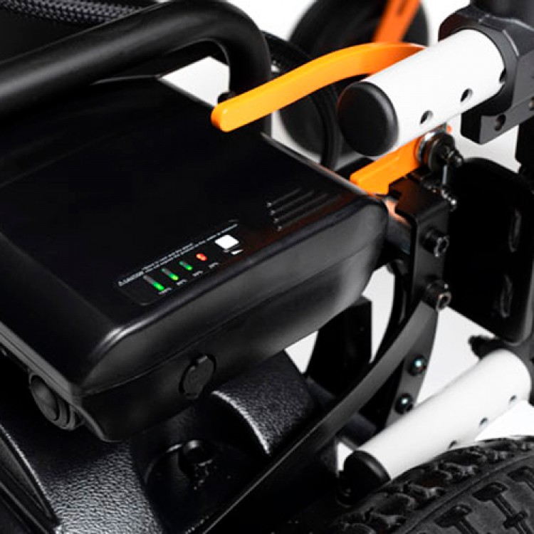 Задний привод с аккумуляторным отсеком легко отстегивается. Оставшаяся часть коляски складывается, как обычная механическая коляска.