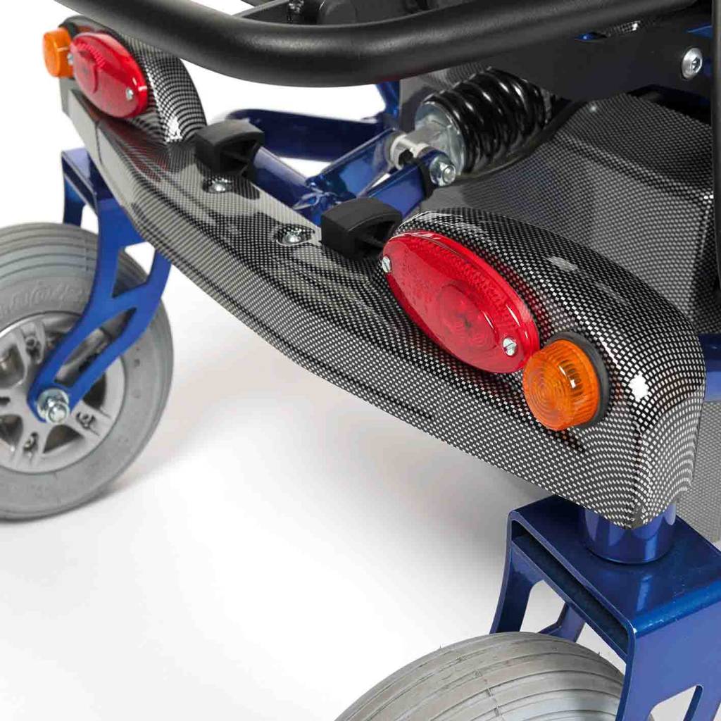 Достоинством данной коляски является наличие амортизаторов и полной независимой подвески, что позволяет с комфортом путешествовать по неровным дорогам. Стабилизирующая ось обеспечивает контакт всех четырех колес с землей при преодолении препятствий высотой до 90 мм. Конструкция коляски оснащена передним приводом.
