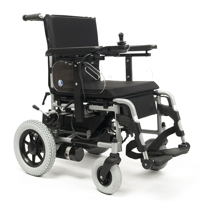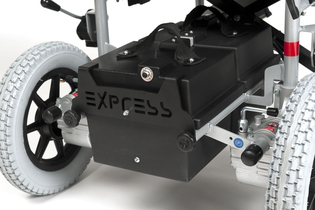 Кресло-коляска Vermeiren Express 2009 с электроприводом обладает особенностью: колёса можно сложить по типу механизма складывания ножниц. Анатомическое сиденье и подлокотники регулируются. Двигатель позволяет развивать скорость до 6 км в час. Одного заряда хватает на 25 км пути.