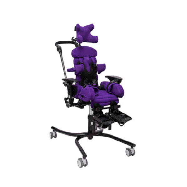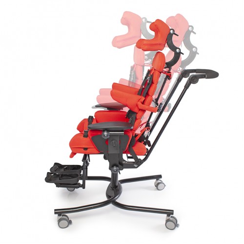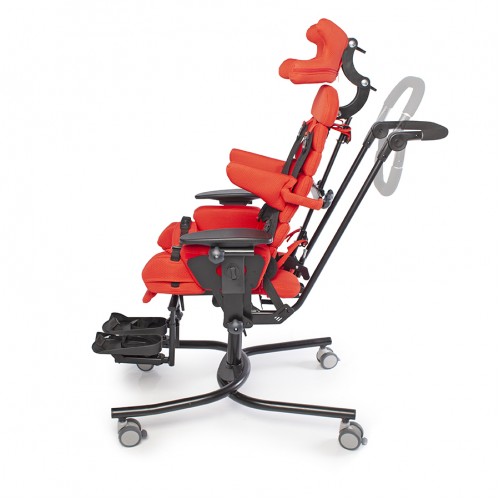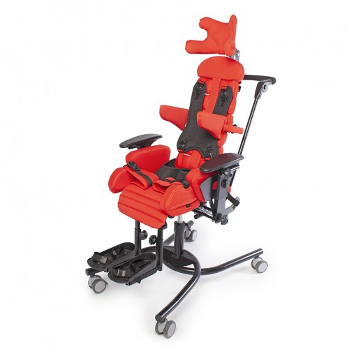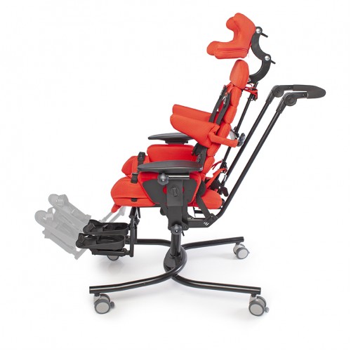 Компоненты: рама шасси RS с регулировкой по высоте, сиденье-кресло, колеса, съемная обивка, стабилизирующие тазовые ремни, подлокотники, ремень-жилет, боковые упоры для туловища, тазовые упоры, упоры для коленей с абдукторными ремнями, ручка для сопровождающего лица, подножка с ремнями для стоп.