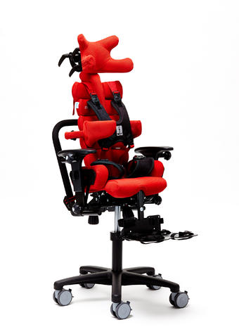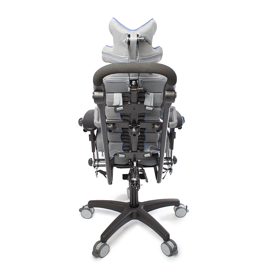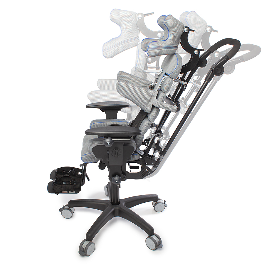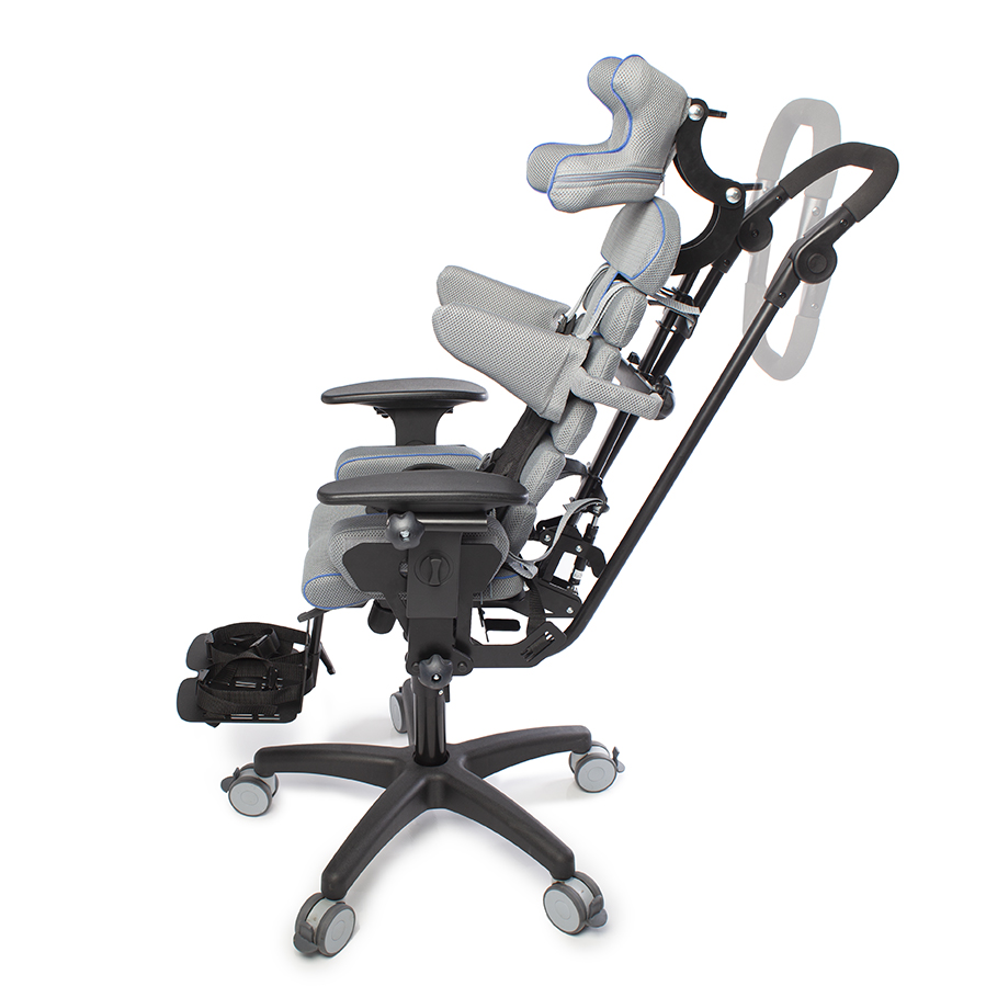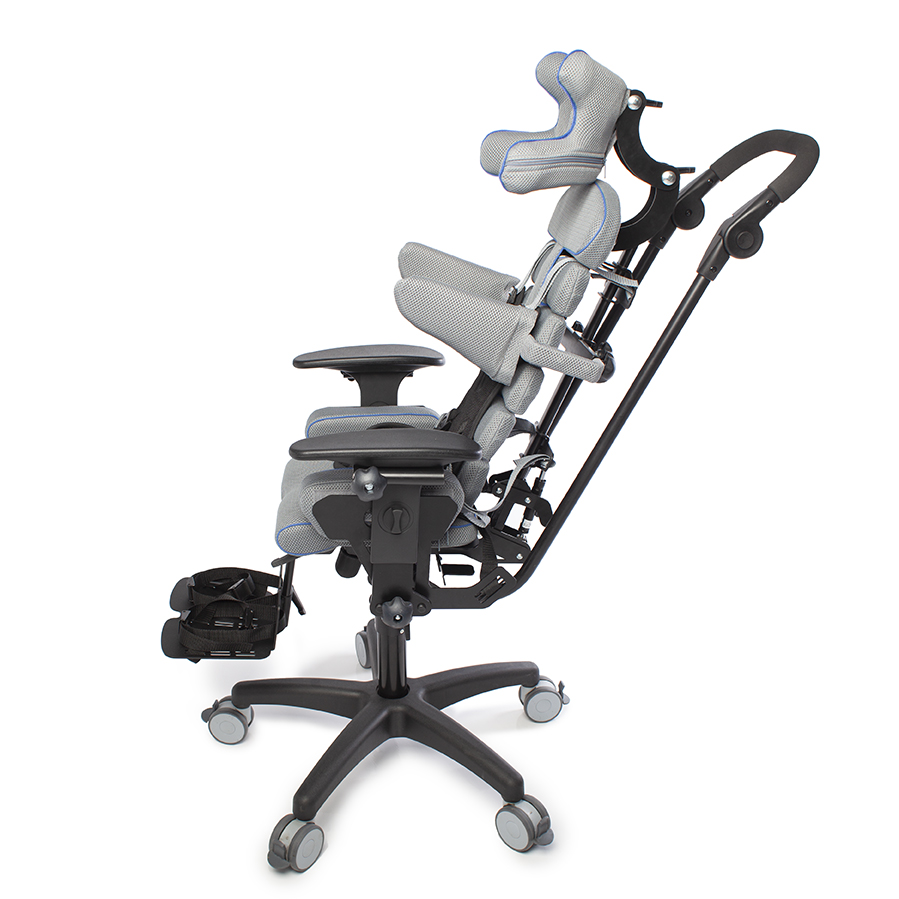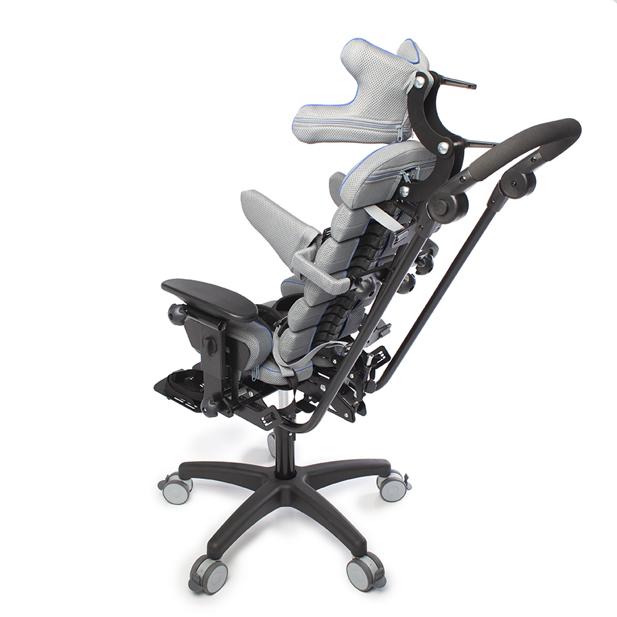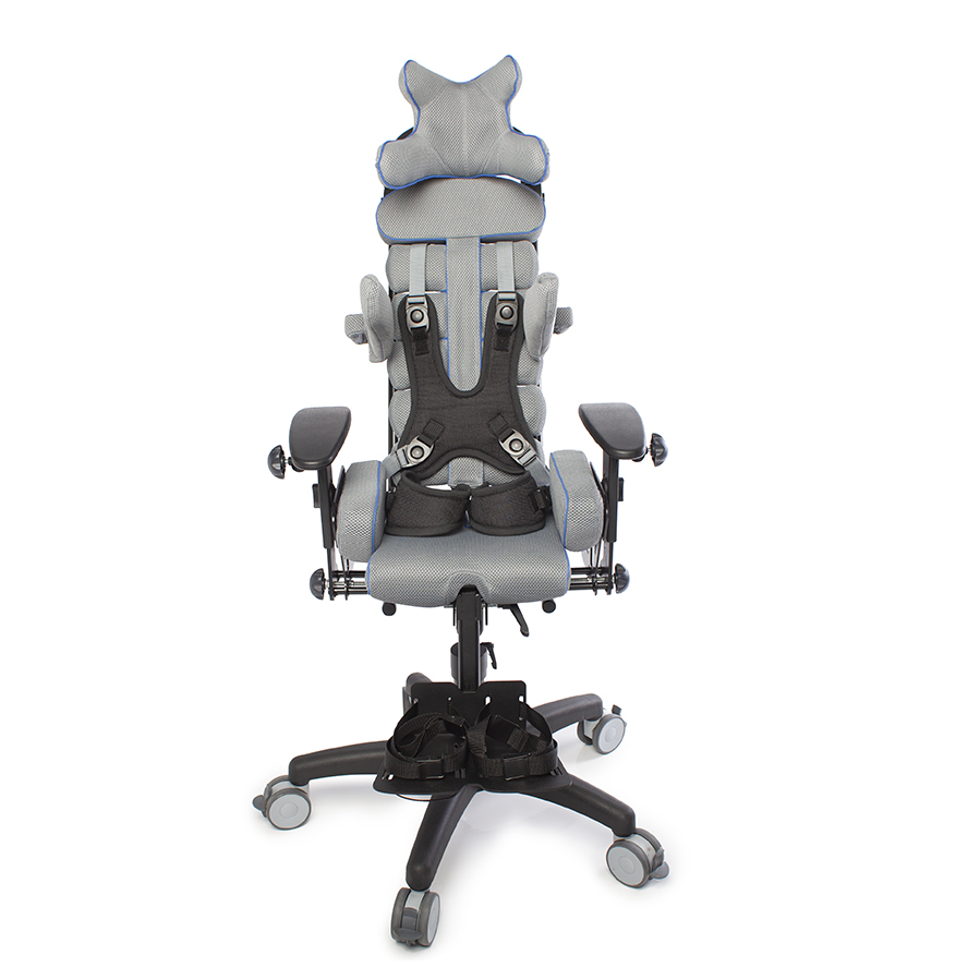 Конструкция кресла Baffin neoSIT : сиденье, спинка, боковые упоры для туловища, подножка с опорами для стоп, подголовник, ремни для бедер, ремень-жилет и опорная рама. Съемную обивку можно стирать.
