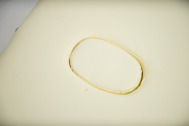 Массажный стол-чемодан со складной панелью из кремовой экокожи. Подковообразный, регулируемый по углу наклона подголовник снабжён регулируемой мягкой полочкой для рук, а съёмные расширители ложа обеспечивают комфортное размещение пользователя в любом необходимом положении, благодаря закрывающемуся инсертом лицевому люверсу. Телескопическая регулировка высоты ножек на пружинно-шариковых фиксаторах позволяют установить стол на высоте, удобной как клиенту, так и массажисту.