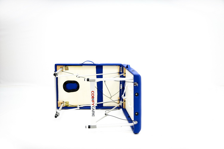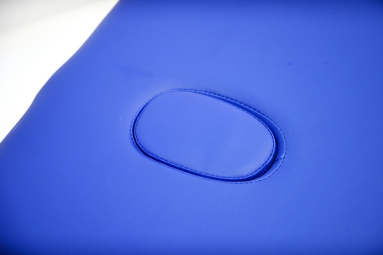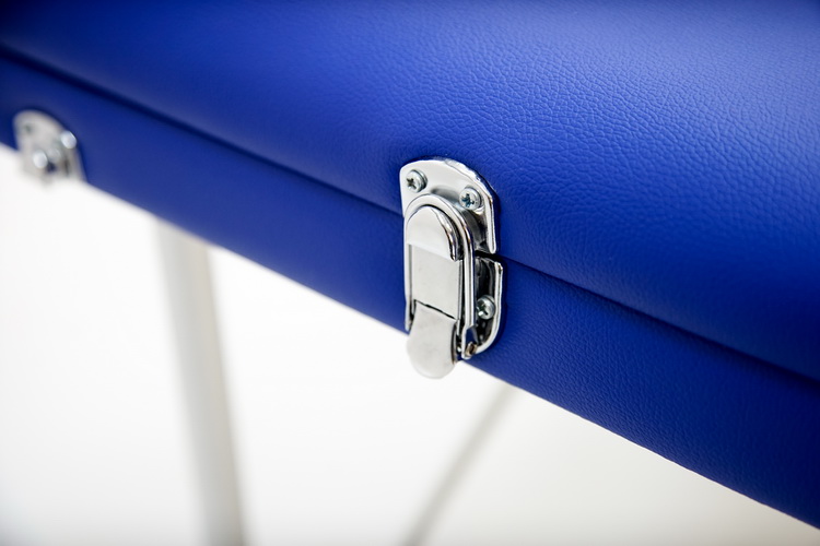 Массажный стол обладает лёгким и прочным алюминиевым каркасом с телескопической регулировкой высоты ножных опор, позволяющими устанавливать стол на удобной для пациента и врача высоте. Виниловое покрытие ложа с ППУ-наполнением выполнено из винилискожи синего цвета.