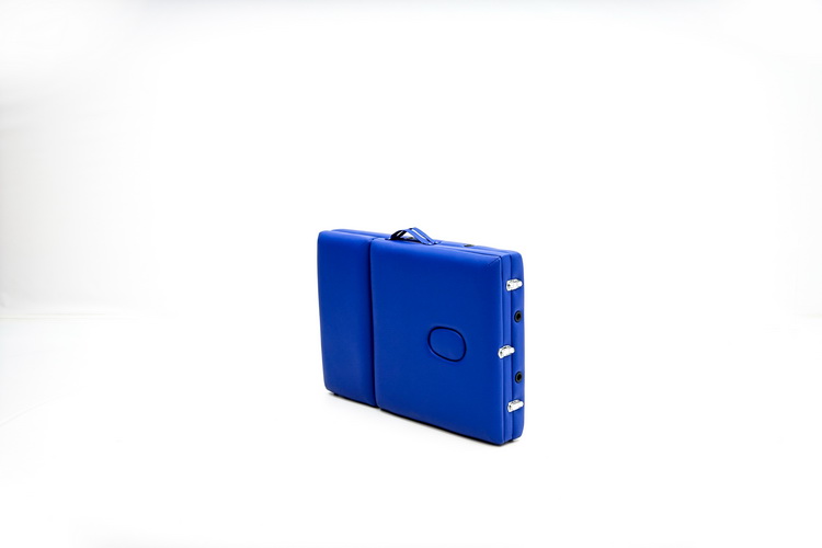 Массажный стол-чемодан актуального дизайна, с панелью в синем цвете, компактно складывается для удобной транспортировки и убирается в сумку-переноску. Оборудован поднимающимся подголовником, снабженным лицевым вырезом, продублированным в изголовье и закрывающимся мягким инсертом, регулируемым подвесом для рук.