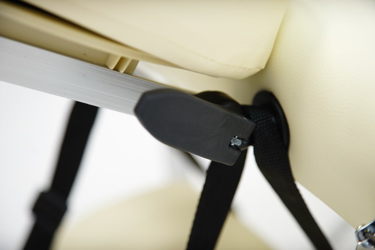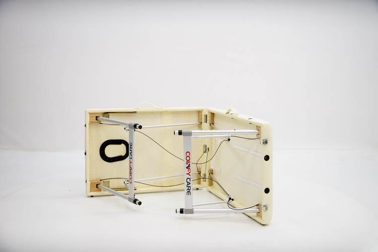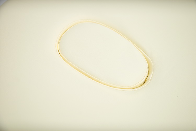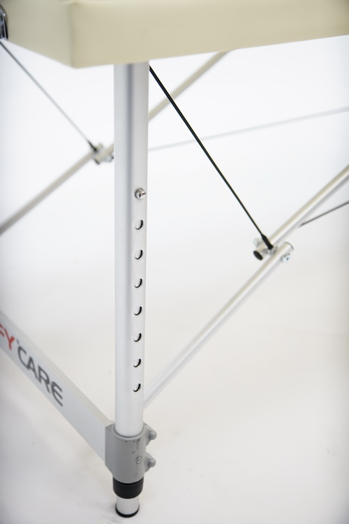 Массажный стол обладает лёгким и прочным алюминиевым каркасом с телескопической регулировкой высоты ножных опор, позволяющими устанавливать стол на удобной для пациента и врача высоте. Виниловое покрытие ложа с ППУ-наполнением выполнено из винилискожи кремового цвета.