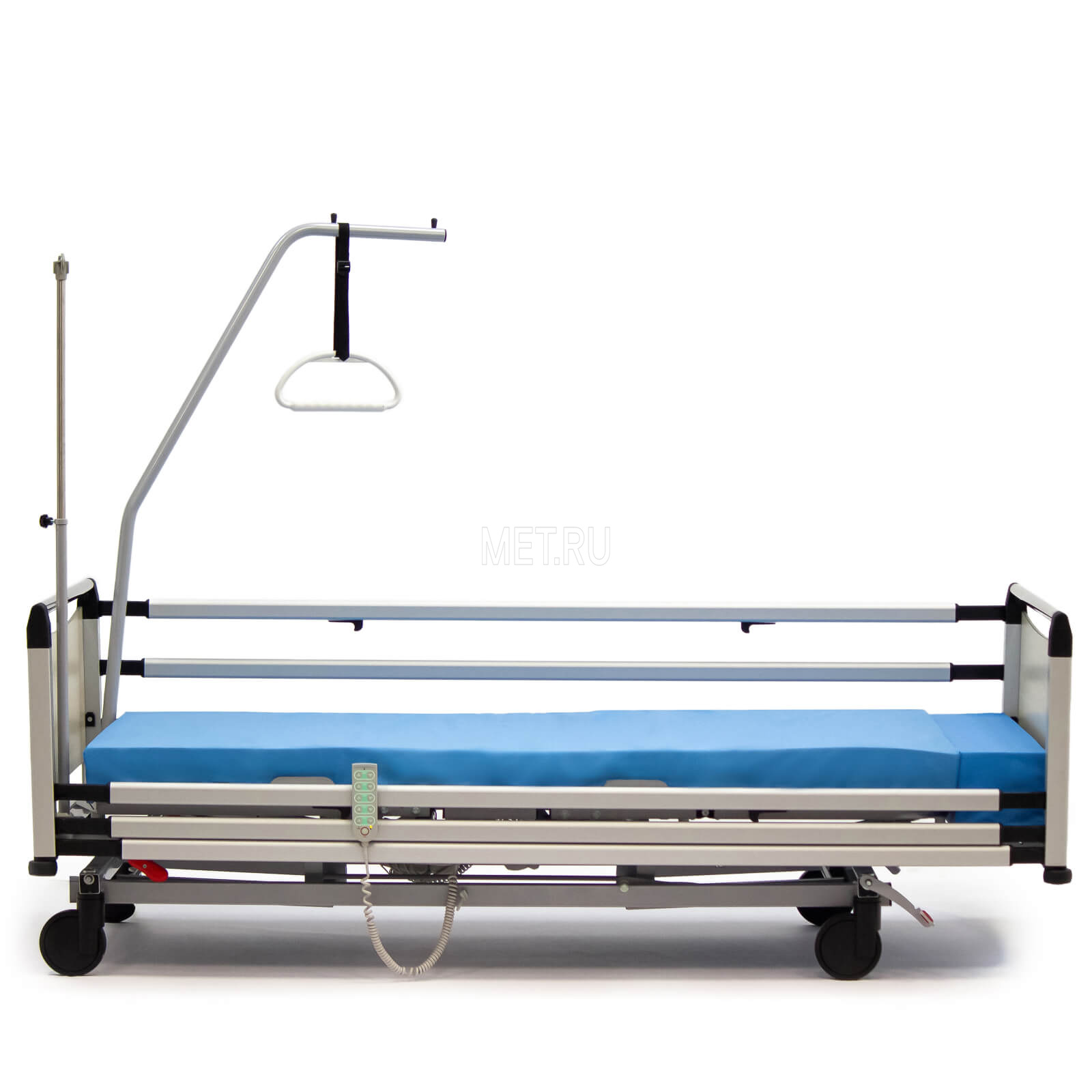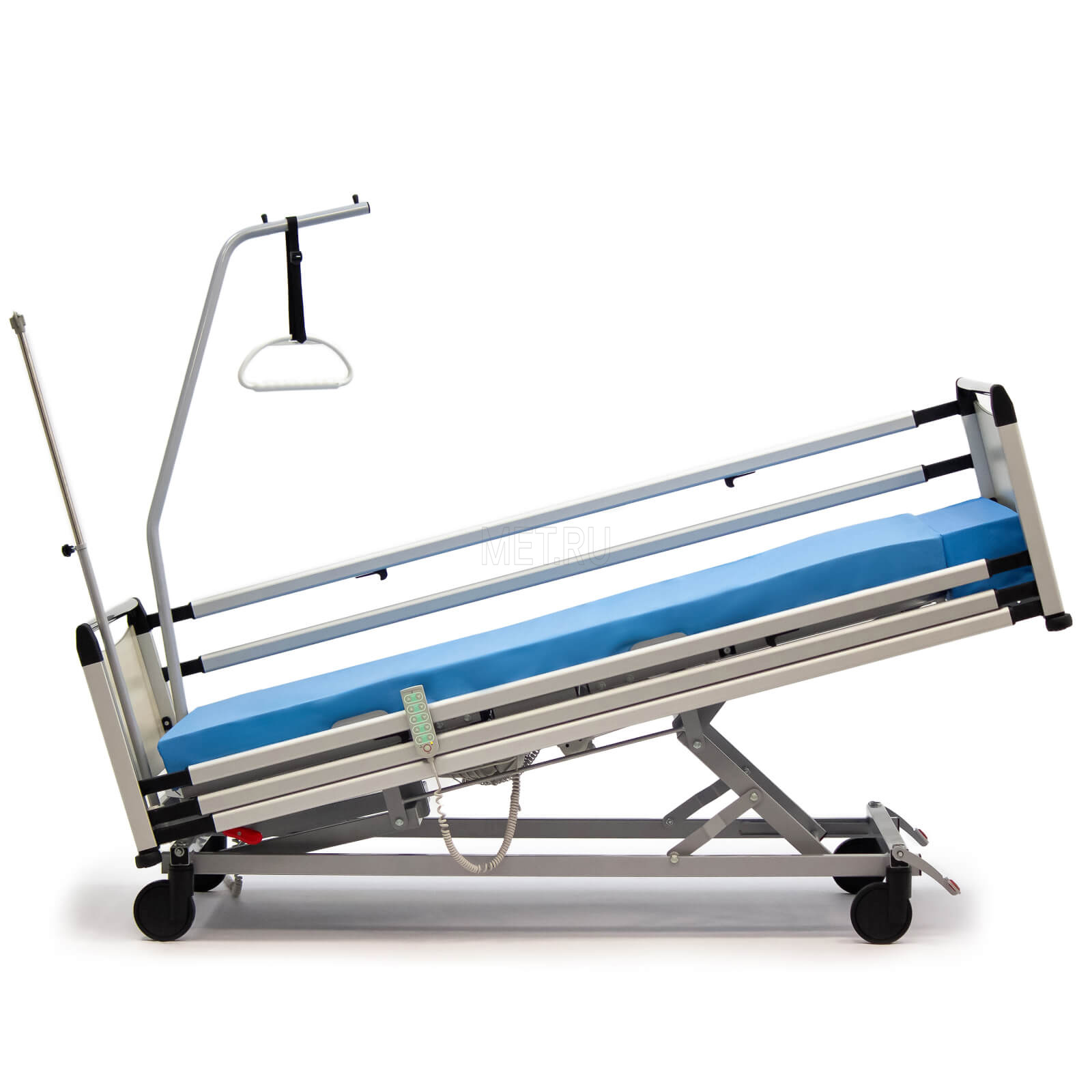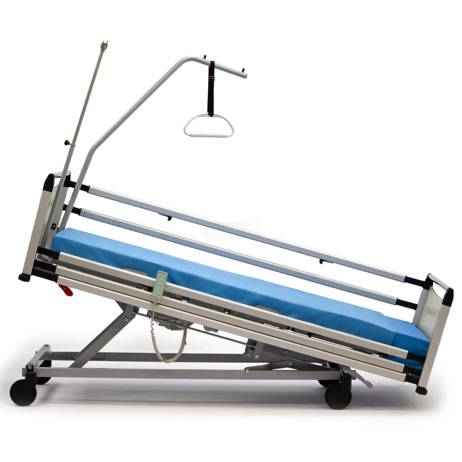 Кровать оборудована проводным пультом управления, позволяющим регулировать положение изголовья и ножной секции. Регулировка ножной секции осуществляется механизмом «растомат». Высота ложа данной кровати может регулироваться. Алюминиевые боковые ограждения плавно опускаются, обеспечивая доступ к пациенту. Модель способна выдержать вес до 230 килограммов.