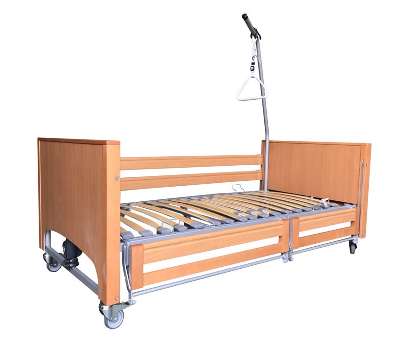 Кровать с электроприводом поставляется в комплекте с боковыми ограждениями и устройством для подтягивания для удобства и помощи в изменении положения тела пациента.