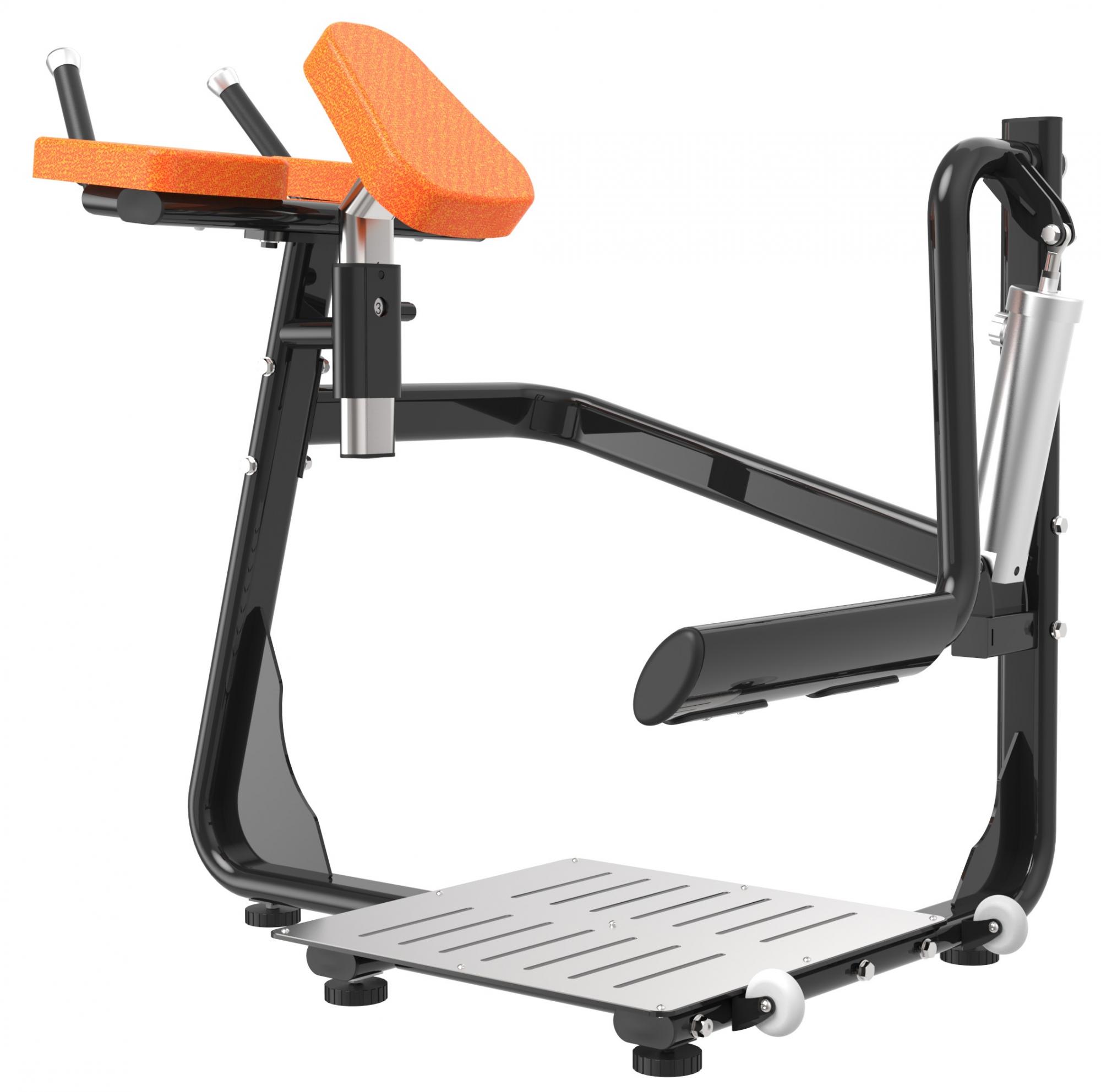 Глют-машина предназначена для выполнения движения жим ногой назад, направленного на тренировку следующей группы мышц: большая ягодичная, средняя ягодичная, полусухожильная, тонкая мышца, бицепс бедра.