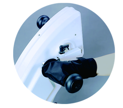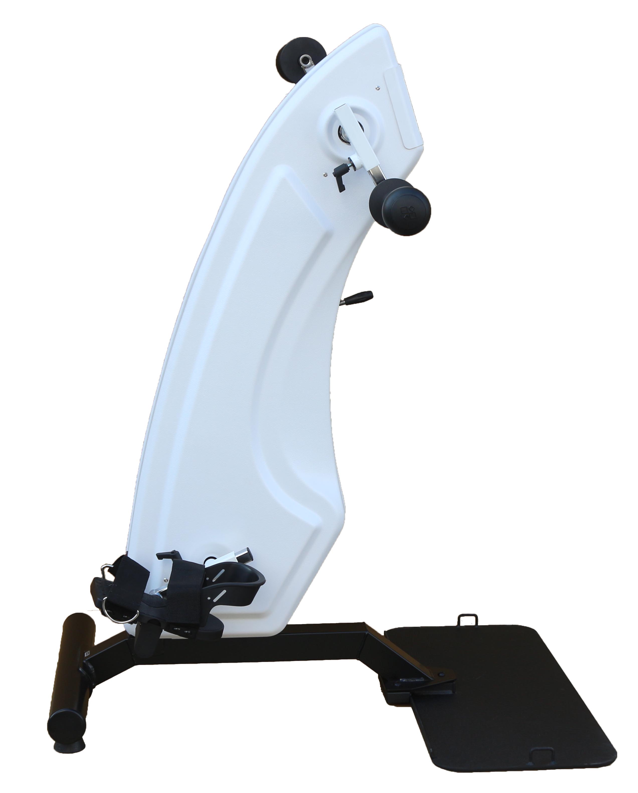 Тренажер для активно-массивной механотерапии AMF адаптирован для тренировок пациентов в инвалидных креслах. Для этого в основании тренажера установлены скобы, позволяющие прикрепить колеса кресла лямками.