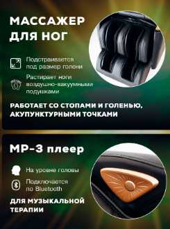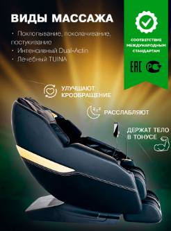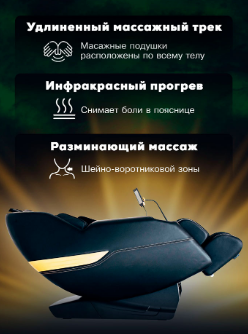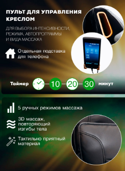 - Кресло оснащено продвинутой системой аэромассажа и 2D-механизмом массажа, а также функцией подогрева для улучшенного расслабления мышц. Обладает тремя уровнями настройки нулевой гравитации и оснащено подушками безопасности для всего тела. Настройка интенсивности массажа обеспечивает гибкость, чтобы подстроиться под ваши потребности.