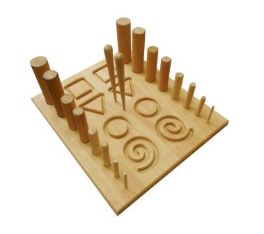 Панель из натурального дерева с вырезанными парными фигурами (квадрат, круг, треугольник и т.д.) и параллельно попарно расположенными отверстиями. Комплектуется двумя стилусами и парными колышками круглого сечения различной высоты и диаметра (по 2 колышка каждого типоразмера).
